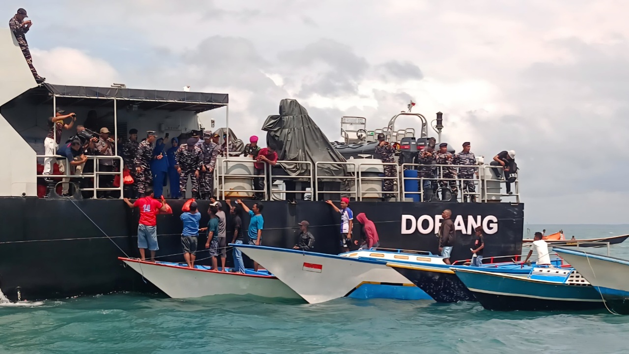 Sekitar pukul 14.00 WIT, kapal tiba di titik kumpul nelayan di perairan belakang Pulau Wamar. Dari atas geladak kapal perang tersebut, para personel TNI AL membagikan paket sembako secara langsung kepada nelayan yang telah menunggu di atas perahu mereka.